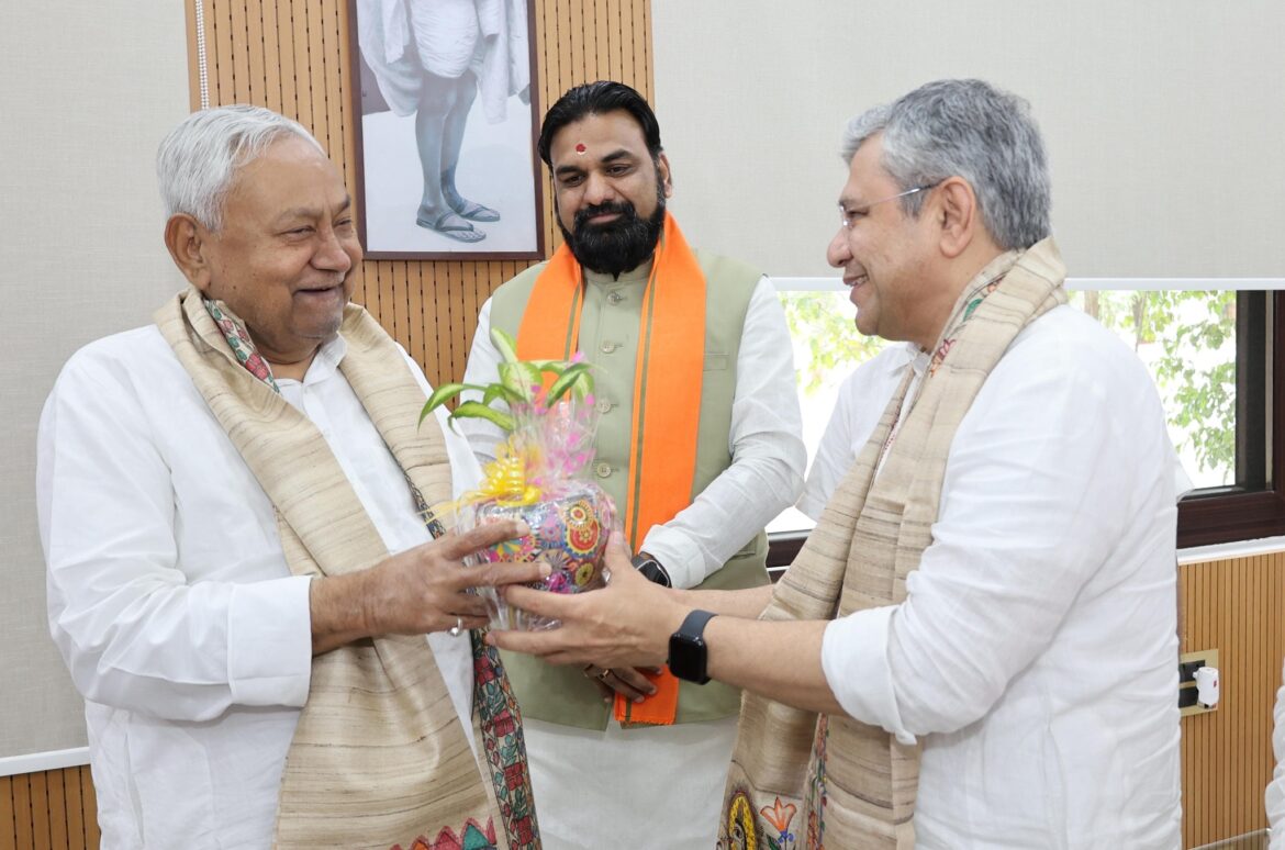 पटना : मुख्यमंत्री नीतीश कुमार के 1 अणे मार्ग स्थित आवास में शुक्रवार को केंद्रीय रेल मंत्री अश्विनी वैष्णव ने सीएम नीतीश कुमार से शिष्टाचार मुलाकात की। केंद्रीय मंत्री राजीव रंजन सिंह उर्फ ललन सिंह भी उपस्थित रहे। मुलाकात के दौरान नीतीश कुमार ने गर्मजोशी से दोनों नेताओं का स्वागत किया।